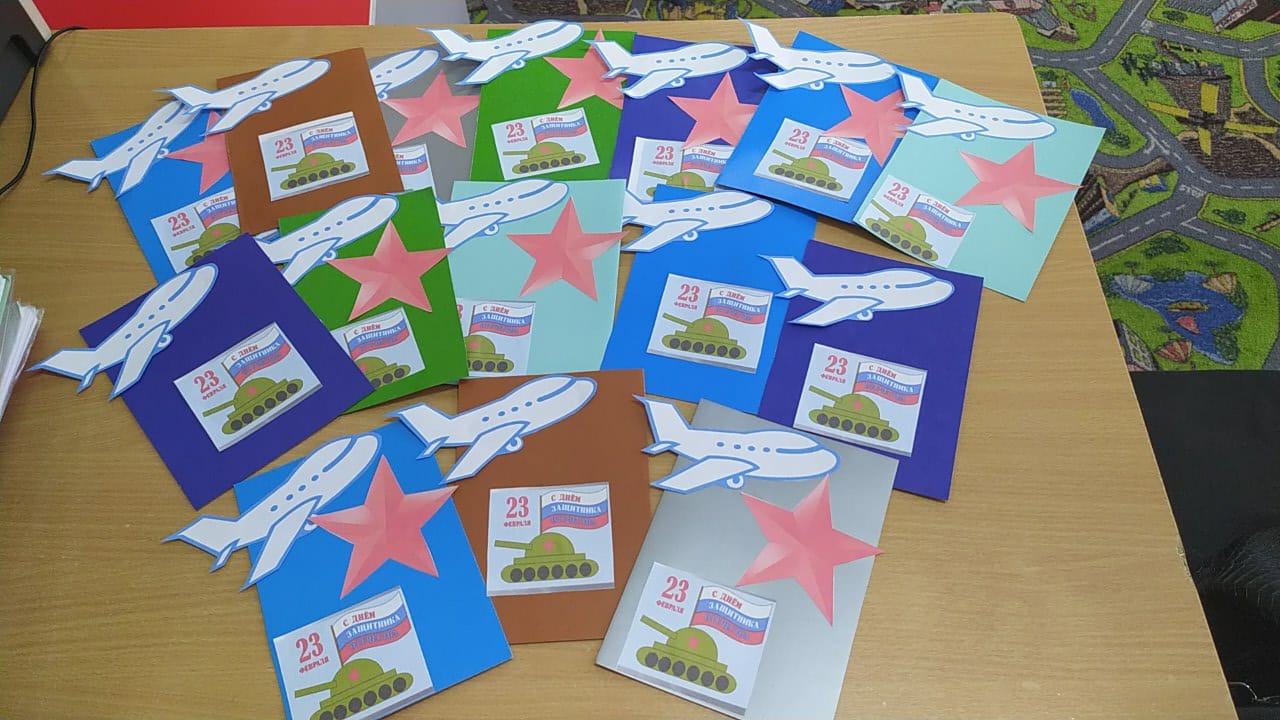 Воспитатели старших и подготовительных групп изготовили с детьми открытки для пап к 23 Февраля.