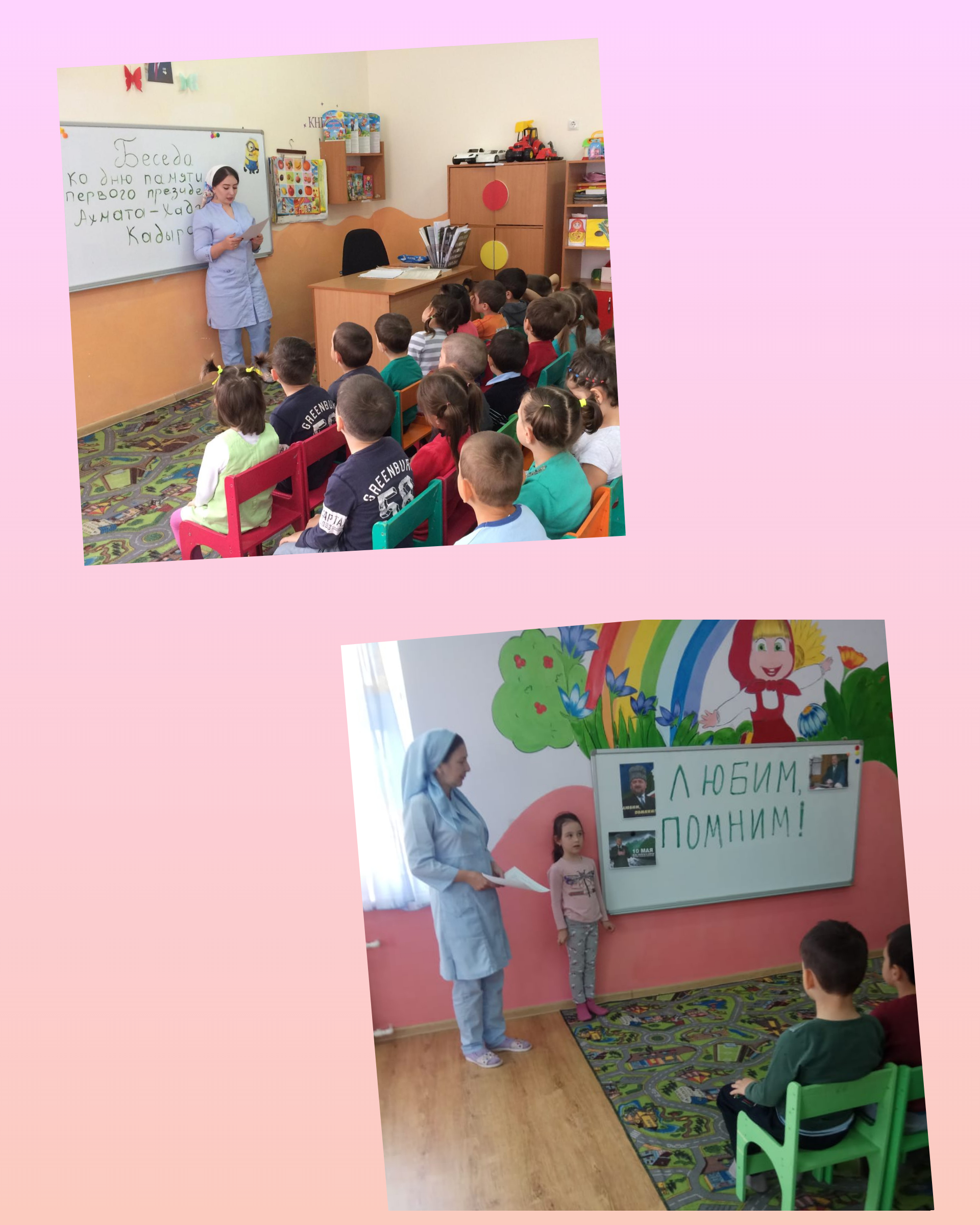 в МБДОУ "Детский сад №2 "Маленькая страна" во всех возрастных группах прошли беседы посвященные Первому Президенту ЧР А.Х.Кадырову, на тему: "Любим и помним"
